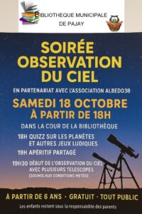 La BIBLIOTHEQUE MUNICIPALE DE PAJAY organise une soirée d’observation du ciel animée par le club Albedo38